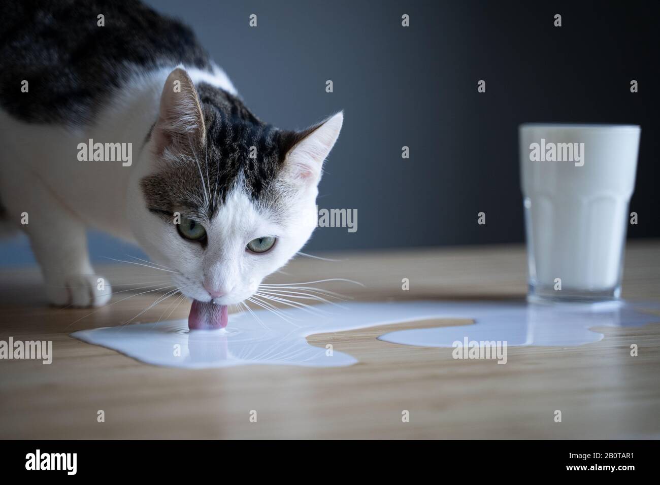 Front View Closeup Of White Cat Licking Milk Spilled In A Puddle