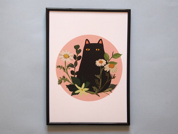 A4 Black Cat With Foliage Print Black Cat Cat Lover Gift Etsy